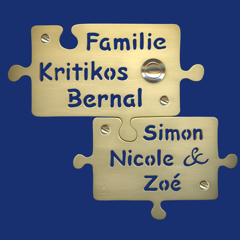 Schönes zweiteiliges Klingelschild in Puzzleteil-Form, vertikal / versetzt angeordnet, mit jeweils dreizeilig angeordneten ausgesägten Namen. HANDARBEIT aus Messing massiv, geschliffen, unbehandelt Mit anschlussfertig montiertem, goldenem Klingeltaster aus Messing. Oder als Kupferschild mit dunkel-kupferfarbenem Klingeltaster, als schwarz patiniertes Kupferschild mit silbernem Klingeltaster aus Edelstahl oder aus Aluminium, unbehandelt oder transparent eloxiert (wetterfeste, galvanische Beschichtung) mit Klingeltaster aus Edelstahl und jeweils insgesamt vier Bohrungen zur Befestigung mit passenden Linsenkopf-Senkschrauben.